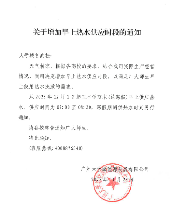 为了更好的满足广大师生对学生宿舍热水的使用需求,大学城能源公司根据当前天气实际情况及大学城各高校需求,例行增加早上热水供应时段。具体安排如下: